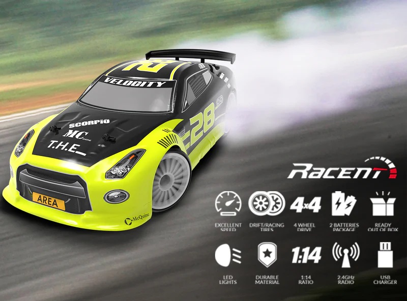 Model samochodu RACENT Drift Car 1/14 posiada napęd 4x4, idealnie nadaje się do driftowania dzięki osiąganej prędkości do 25 km/h. Doskonały zarówno do wyścigów w pomieszczeniach, jak i na zewnątrz. Wyposażony w wymienne opony dzięki czemu może służyć również do wyścigów.