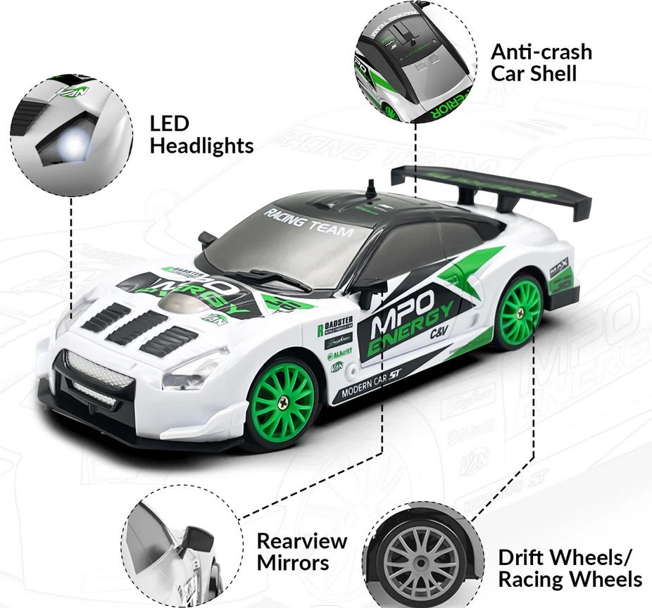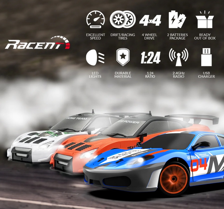 Zapraszamy do wspaniałego świata prędkości z naszym zdalnie sterowanym modelem RC RACENT Thrill Rider. Model ten posiada napęd 4x4, osiągający prędkość do 15 km/h. Doskonały zarówno do wyścigów w pomieszczeniach, jak i na zewnątrz. Wyposażony w wymienne opony do wyścigów i driftingu, umożliwiając szybką zmianę stylu jazdy. Wzbogać nocne wyścigi dzięki wbudowanemu oświetleniu LED w naszym modelu RC drift car. W zestawie znajdziesz 2 akumulatory, zapewniające długie godziny zabawy. Będzie to doskonały prezent dla dzieci i dorosłych! Bez względu na wiek czy płeć, nasz zdalnie sterowany samochód to gwarancja ekscytujących wyścigów i godzinnej rozrywki. Modele drift cars doskonale się prowadzą, zapewniając realistyczne doznania z jazdy. Zaprojektowane z najwyższej jakości materiałów, gwarantują trwałość i długotrwałą wydajność.