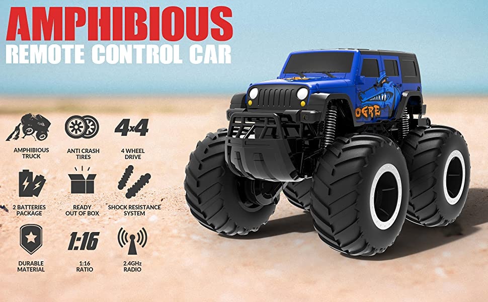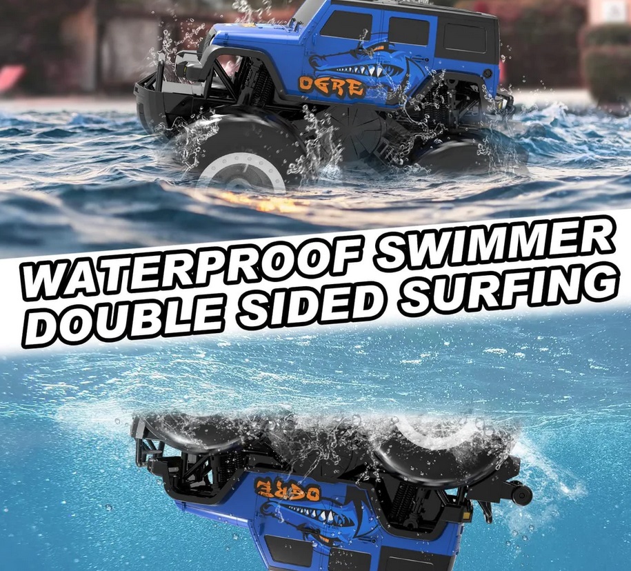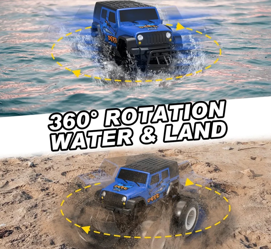 STEMTRON Amphibious to zdalnie sterowany samochód-amfibia, może działać dwustronnie, przewracać się do przodu i do tyłu oraz obracać się o 360 stopni na wodzie i na ziemi. Konstrukcja terenowa z napędem na 4 koła umożliwia łatwe przedostanie się przez ziemię, piasek, błoto, trawę, śnieg i plażę! Bądź nie tylko terenowym monster truckiem, ale także fajną zdalnie sterowaną łódką do zabawy na basenie i jeziorze, do surfowania po rzece, stawie lub innej powierzchni wody. Do sterowania został zastosowany system radiowy 2,4 GHz, który umożliwia jednoczesne ściganie się wielu samochodów zdalnie sterowanych. Wykonane z najwyższej jakości ABS i nietoksycznych materiałów PVC.