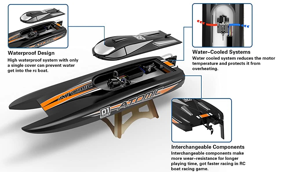 Wbudowany układ chłodzenia wodą pomaga utrzymać chłód łodzi ze zdalnym sterowaniem, co zapewnia dłuższy czas pracy i całodniową zabawę, co wydłuża żywotność silnika.