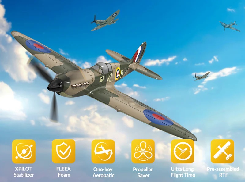 Volantex RC Spitfire F4U 761-12G jest małym samolotem o doskonałych osiągach. Dzięki zintegrowanemu układowi stabilizatora żyroskopu Xpilot z mocnym silnikiem samolot leci stabilnie, zwinnie i potrafi wykonywać akrobacje. Został wyposażony w funkcję akrobacji, wystarczy nacisnąć jeden przycisk i pociągnąć drążek, aby łatwo kontrolować Spitfire i wykonywać akrobację. 3-poziomowy asystent kontroli lotu (poziom początkujący z pełnym asystowaniem / pośredni z częściową asystą / ekspert w zakresie kontroli ręcznej) pomaga początkującym nauczyć się latać krok po kroku. Zasięg aparatury sterującej około 200m, czas latania na 1 ładowaniu do 10 minut.